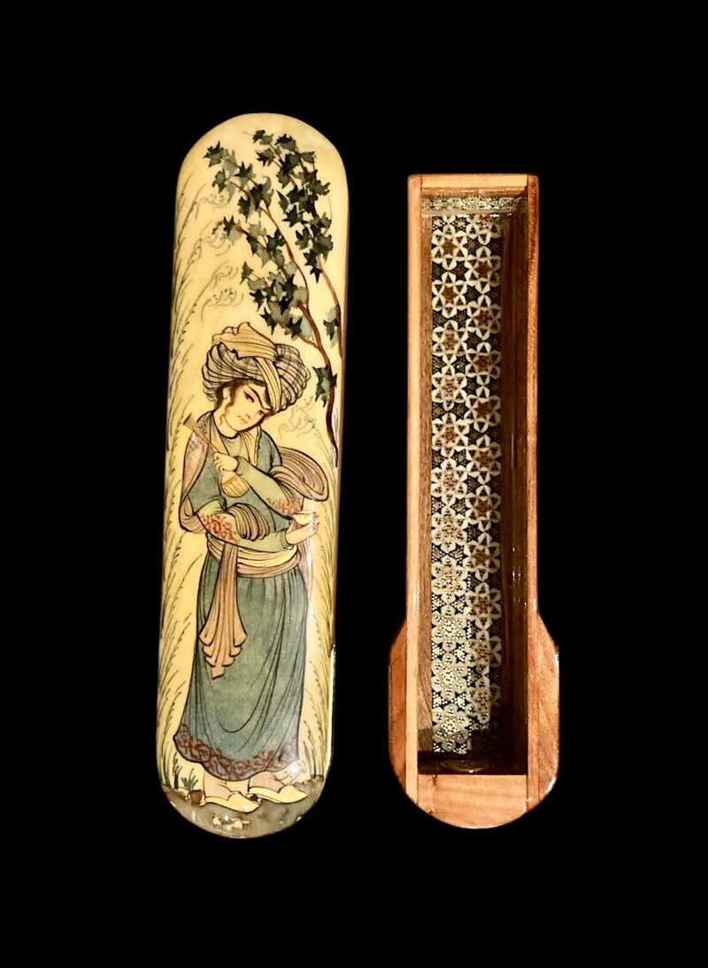Khatam (intarsio)/ Miniatura .Astuccio finemente lavorato e dipinto a mano firma.Esfahan Iran 528466